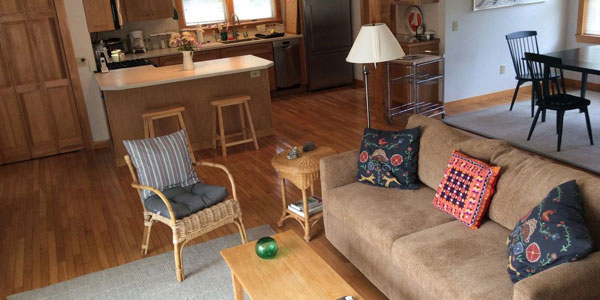 This comfortable and fully equipped waterfront cottage is located in a private setting overlooking Mill River, where the tide slips in and out. No other houses are in sight. A spacious high ceiling “great room” includes living-dining-kitchen plus an adjacent screened porch provides open air dining/lounging. Sliding glass doors along one wall of the living room open out on to a spacious deck to give the interior an airy feel. Indeed, the landscape views spill in from all sides–the sunset glimpsed from the kitchen sink being a special feature for the cook!
